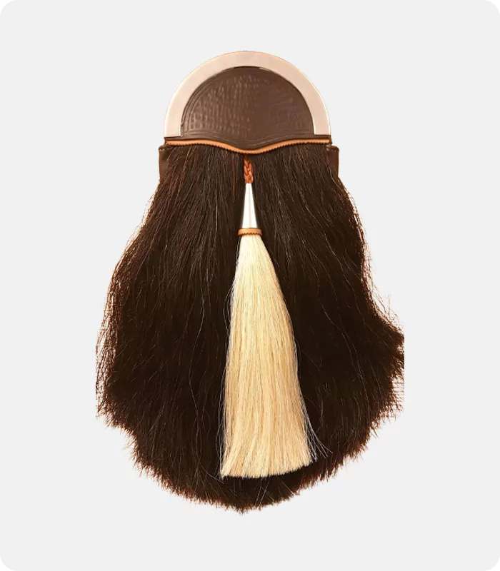 To maintain your item, store it in a cool, dry place away from direct sunlight. Use a soft brush to gently clean the hair and avoid moisture exposure. Metal parts should be polished regularly, and leather elements wiped clean with care. Proper storage and cleaning will keep it looking elegant and ready to wear.
