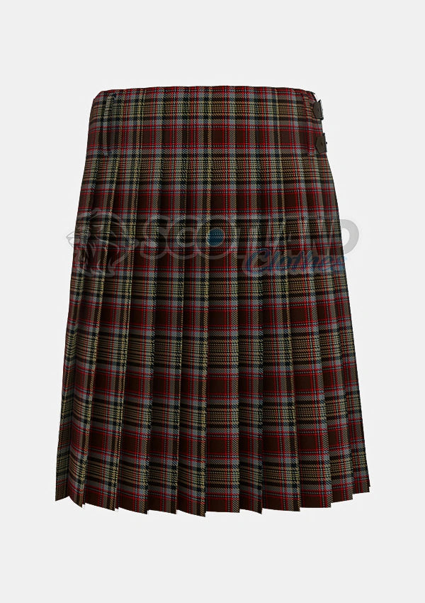Kilts should be dry cleaned to maintain their quality and longevity. For minor spills, gently blot the area with a damp cloth. Always hang your kilt to keep the pleats crisp and avoid wrinkles.